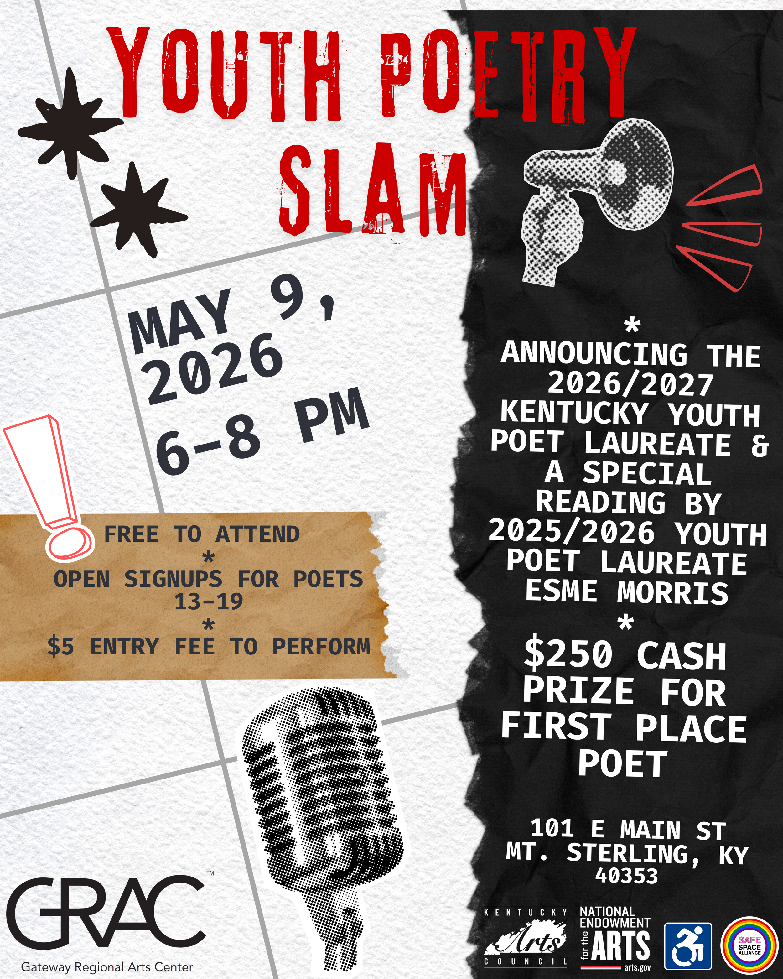 Join us for an evening of powerful voices and bold expression at our Youth Poetry Slam! While the slam is the highlight, there’s so much more in store, featuring a special reading by 2025/2026 Kentucky Youth Poet Laureate Esmé Morris and the exciting announcement of the 2026/2027 Kentucky Youth Poet Laureate.