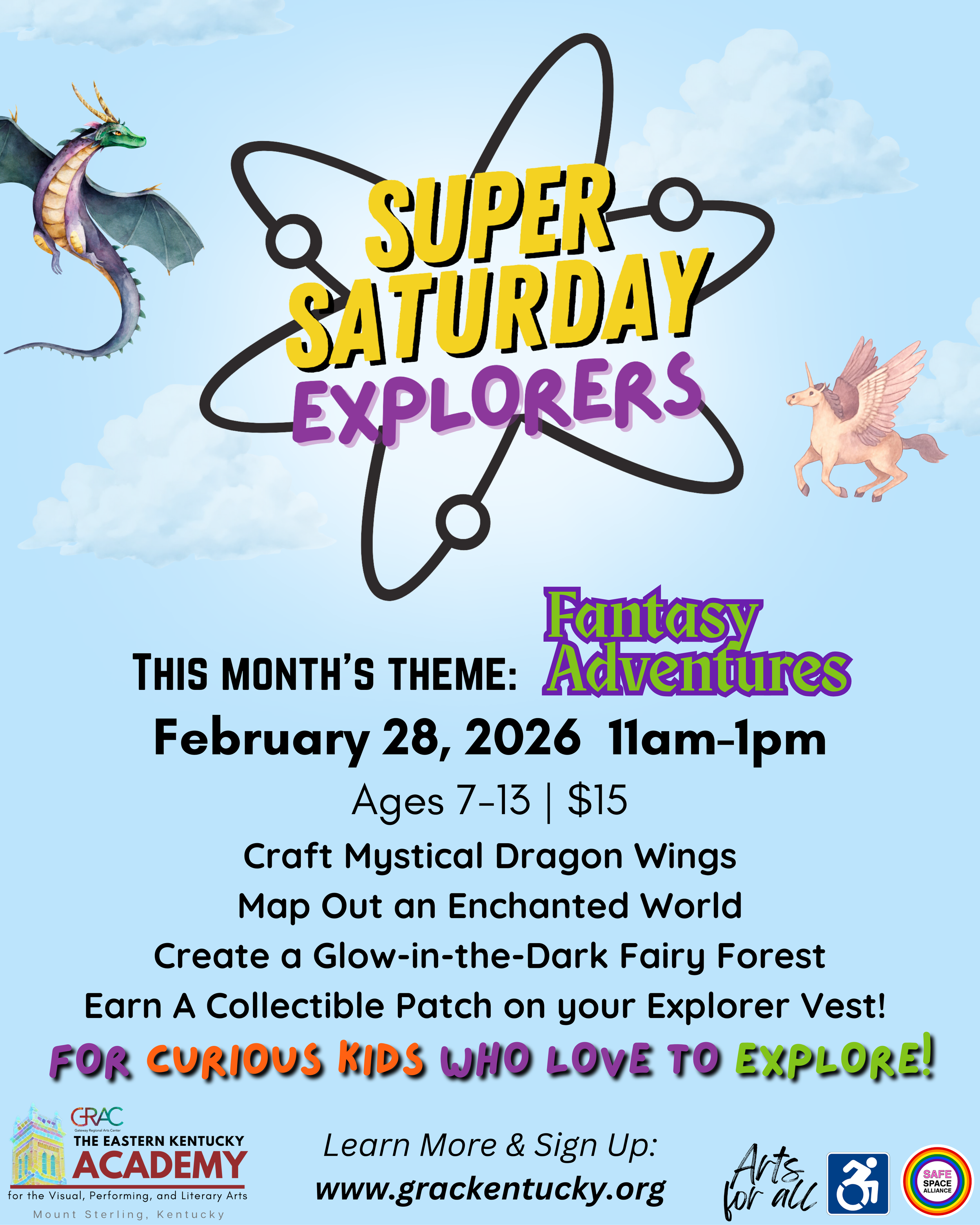 Calling all young explorers! This month’s Super Saturday Explorers theme is Fantasy Adventures! Kids will craft mystical dragon wings, map out an enchanted world, create a glow-in-the-dark fairy forest, and more in this exciting hands-on STEAM workshop where science, technology, engineering, art, and math come to life through fun, themed activities. Each session brings a brand-new adventure designed to spark creativity and curiosity. Explorers receive their own vest and earn a unique themed patch every time they attend. No long-term commitment required—just sign up for the workshops that spark your child’s imagination!
