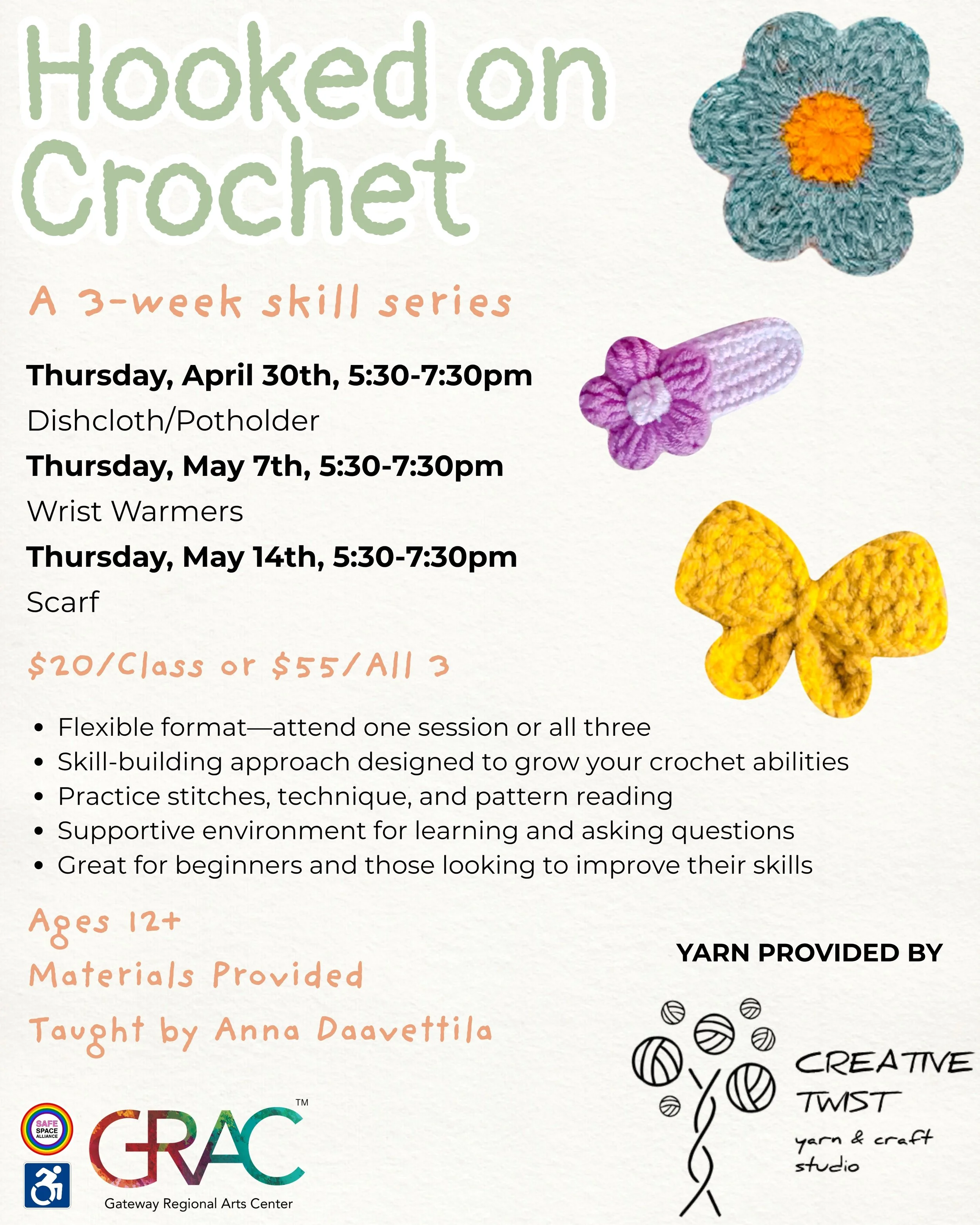 Looking for a creative outlet or a new hobby to unwind with? Join us for a relaxed, hands-on crochet series where beginners are welcomed and supported alongside those looking to build on their skills. Each session features a different project, so you can drop in for just one or come to all three and grow over time. Come solo or bring a friend, get cozy, and enjoy a laid-back evening of making, chatting, and creating with others in the community.