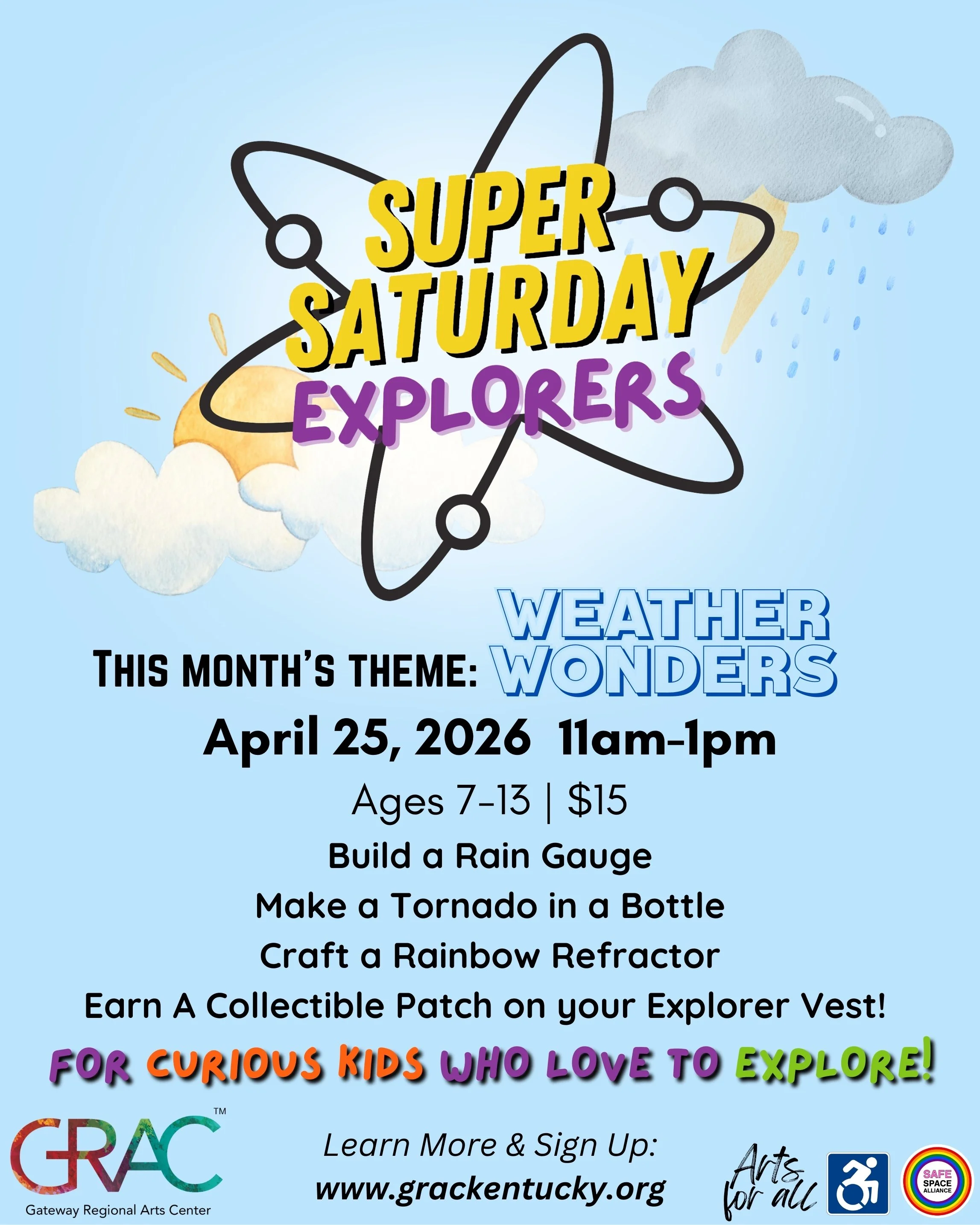 Calling all young explorers! This month’s Super Saturday Explorers theme is Weather Wonders! Kids will build a rain gauge, make a tornado in a bottle, craft a rainbow refractor, and more in this exciting hands-on STEAM workshop where science, technology, engineering, art, and math come to life through fun, themed activities. Each session brings a brand-new adventure designed to spark creativity and curiosity. Explorers receive their own vest and earn a unique themed patch every time they attend. No long-term commitment required—just sign up for the workshops that spark your child’s imagination!